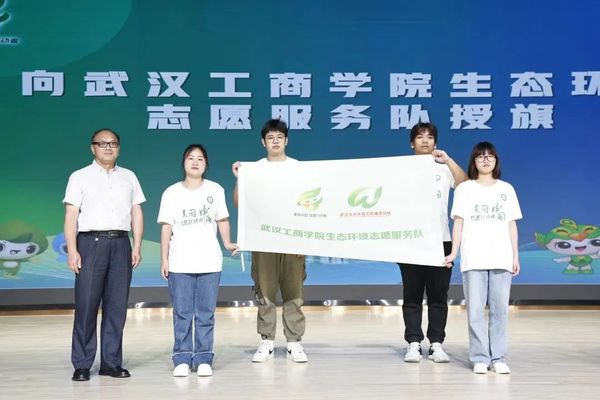 武汉市生态环境宣教中心主任汪璞为武汉工商学院生态环境志愿服务队授旗