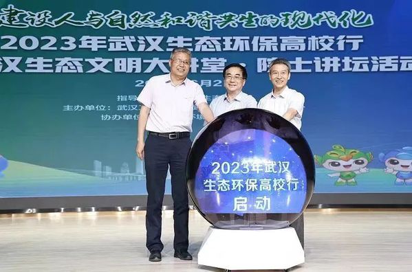 王焰新院士(中)、任宪友副局长(左)、孔建益校长(右)共同启动“2023年武汉生态环保高校行”活动