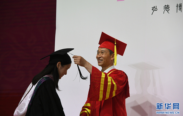图为武汉工商学院校长孔建益为毕业生拨穗。新华网发 蓝静摄