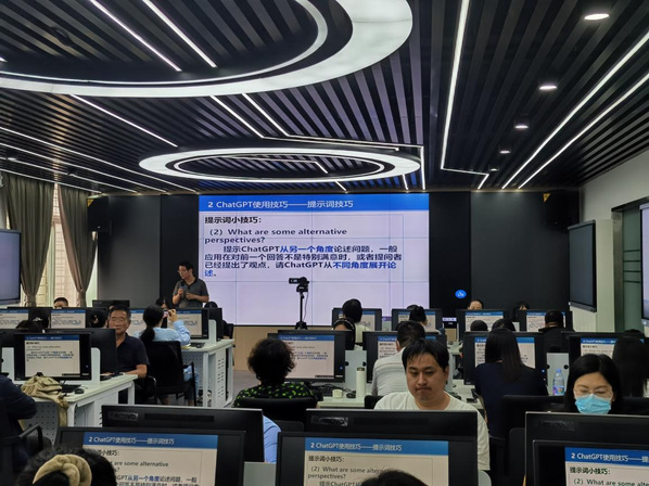 讲座分为两个主题。首先,来自电子商务学院的李进华教授以《ChatGPT赋能教学与科研之路径探析》为主题,深入浅出地讲述了ChatGPT的发展历程、原理以及核心技术。同时也结合自身多年教学教研经验,同现场师生一起探讨了在教育数字化转型中实现信息技术与教育教学、科研深度融合的实践路径。随后,北京鑫锐诚毅数字科技有限公司总经理曲睿为大家带来题为《图谱化思维AI设计与开发虚拟仿真一流课程资源》的报告。他向大家阐述了掌握虚拟仿真SaaS云端应用设计以及开发虚拟现实教育应用资源的方法,即制定信息化、智能化方案。