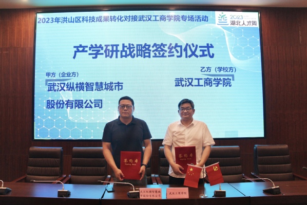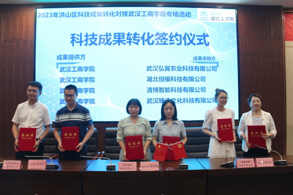 新闻中心讯(记者 万风)6月29日,“科技引领、布局未来”2023年洪山区科技成果转化对接武汉工商学院专场活动在武汉工商学院举行。活动现场,武汉工商学院与湖北恒银科技有限公司、北京清博智能科技有限公司、武汉臻浩文化科技有限公司等9家企业签订了9个科技成果转化横向项目合作协议,与武汉纵横智慧城市股份有限公司签订了校企产学研战略合作协议,并开展了6个项目的路演活动。