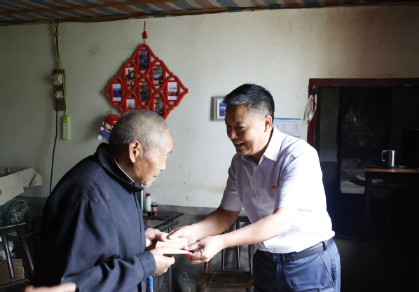 座谈结束后,刘生元书记一行还冒雨专程走访慰问了穿心店村“三类人员”(脱贫不稳定户、边缘易致贫户、突发严重困难户)及一批老党员,为他们送上慰问金及慰问品。在脱贫不稳定户向长淼家,刘生元书记得知向长淼前不久发生车祸才从医院出院后,关切地询问了他身体康复情况及各类保障政策落实情况,并嘱咐他:“养好身体、早日康复,在党的好政策下勤劳致富,有任何困难都可以向驻村工作队反馈,我们会尽力帮助解决”。临走前,刘生元书记还特地交待驻村工作队多关心向长淼及其80多岁的老母亲。