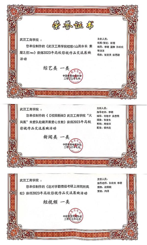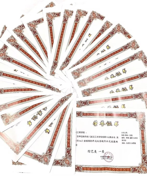 武汉工商学院宣传策划部报送的《武汉工商学院校歌<山高水长素履之往>MV》荣获综艺类一等奖,《武汉工商学院“火凤凰”关爱队赴藏开展爱心支教》获新闻类一等奖,《这对学霸情侣考研上岸同所高校》获短视频类一等奖;《武汉工商学院2022级新生开学典礼暨军训成果汇报大会顺利举行》《武汉工商学院喜迎2022级新生》获新闻类二等奖,《余寿勇——青春在志愿服务中闪光》获纪录片类二等奖,《毕业向上季——优秀毕业生专访》《献礼五四致敬青春》获专题片类二等奖,《毕业季MV<入海>》《武汉工商学院音乐会》获综艺类二等奖,《武汉工商学院宣传片<踔厉创新正芳华>》《一分钟,在武工商会发生什么》获学校形象宣传片类二等奖,《坚持晨读16年 武汉工商学院英语俱乐部助力学生轻松快乐学英语》《“银”为有你 三生有“杏”》《考研MV<我们的明天>》获短视频类二等奖。