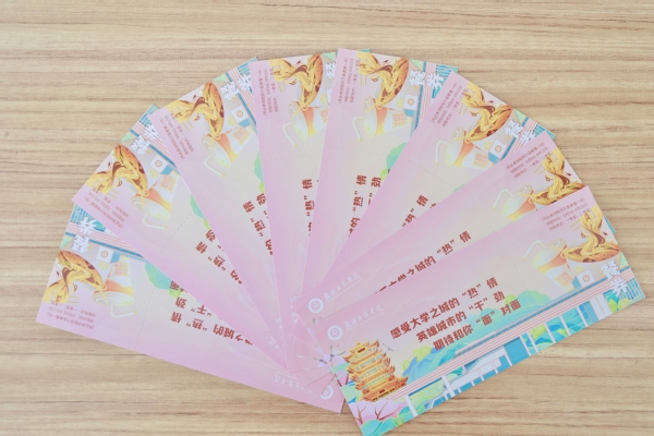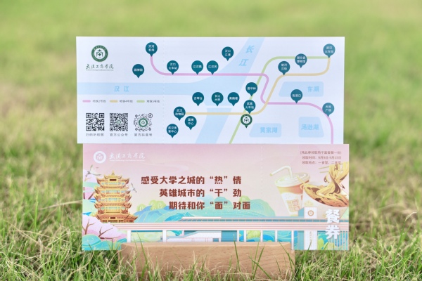 今年,学校新生录取通知书除了延续往年的精美设计,还附赠了一张创意十足的餐券。餐券正面融合了武汉市著名景点“黄鹤楼”、荆楚特色美食“热干面”以及学校标志性建筑“南门”等设计元素,层次丰富,描摹细微,希望新生们能第一时间“感受大学之城的‘热’情、英雄城市的‘干’劲、期待和你‘面’对面”,充分展现了英雄城的钟灵毓秀之美、武工商的温暖人文之韵。