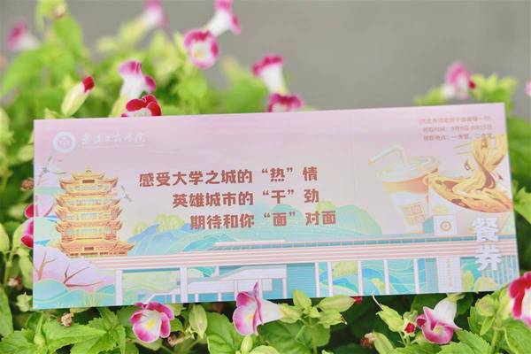 录取通知书里附赠的餐券,设计上融合了著名景点黄鹤楼、特色美食热干面及该校标志性建筑南门等元素,希望新生们“感受大学之城的‘热’情、英雄城市的‘干’劲、期待和你‘面’对面”。