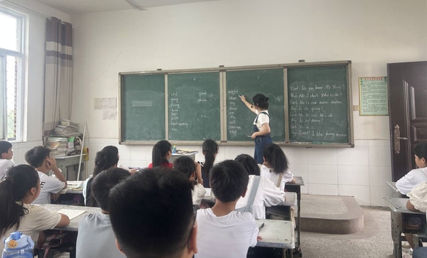 图为志愿者为孩子们上英语课 摄影:肖宁