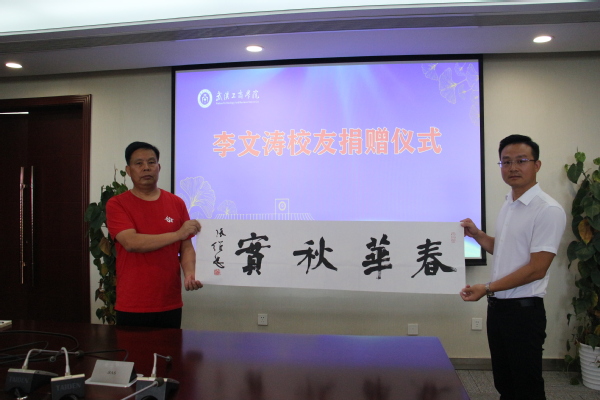 图为李文涛校友向学校捐赠中国著名书法家张维忠的字画《春华秋实》 摄影:杨培