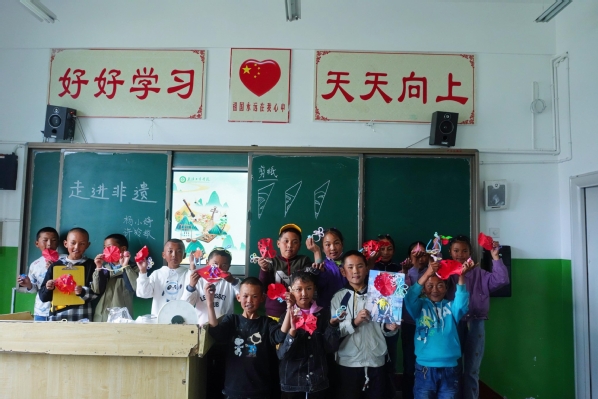 图为康雄乡中心小学学生课后展示自己的剪纸、泥塑、绒花作品 摄影:杨小婷