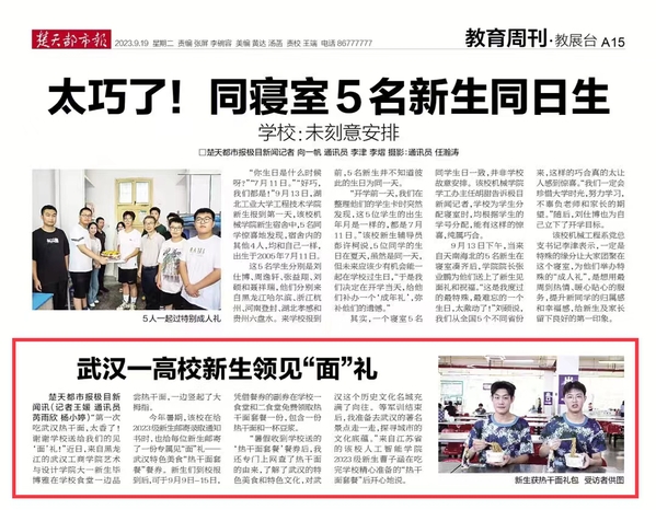 今年暑期,该校在给2023级新生邮寄录取通知书时,也给每位新生邮寄了一份专属见“面”礼--武汉特色美食热干面套餐”餐券,新生们到校报到后,可于9月9日-15日,凭借餐券的副券在学校一食堂和二食堂免费领取热干面套餐一份,包含一份热干面和一杯豆浆。