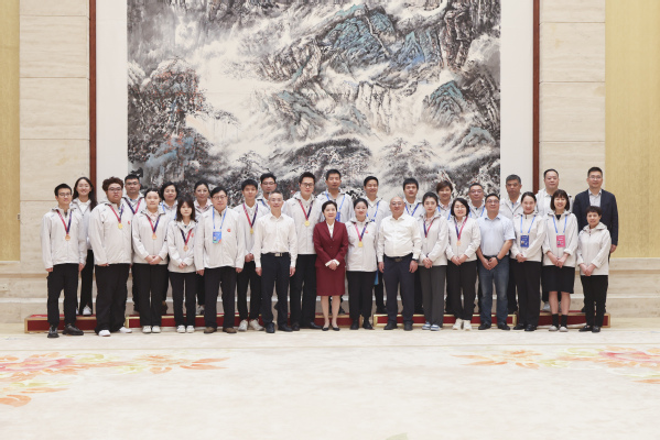 图为湖北省人社厅厅长刘艳红、副厅长李一丹、职建处处长王进军与参赛选手合影