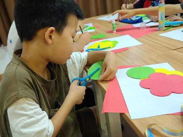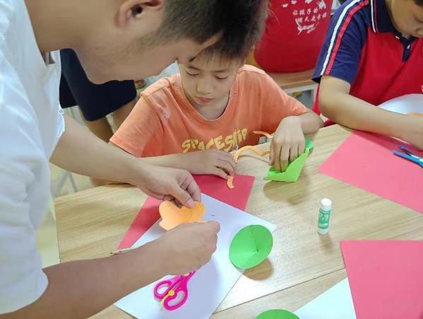 志愿者们耐心地教小朋友画图、裁剪、折纸,小朋友们兴趣十足,边看边学边动手,忙得不亦乐乎。