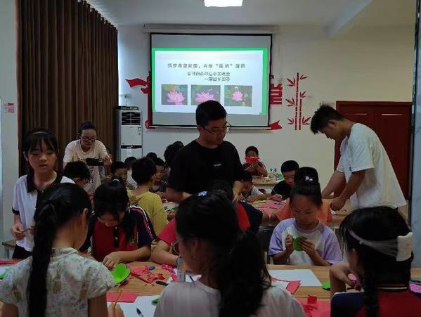 7月20日上午,蒲团乡团委组织武汉工商学院物流学院希望家园团队在乡新时代文明实践所开展“筑梦希望家园,共绘‘莲·洁’蒲团”主题活动,志愿者们给小朋友上了一堂丰富的非遗手工课,以夏莲为主题,教小朋友自己动手,制作一朵蒲团代表性的荷花。