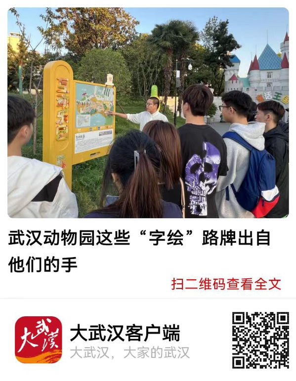 长江日报大武汉客户端10月11日讯 “这些命名牌的字里面都是动物插画,细节丰富,色彩鲜亮,所以我们远看是字,近看就可以看到活泼可爱的动物形象了!”10月8日,在焕然一新的武汉动物园内,武汉工商学院艺术与设计学院副教授徐郑冰为大学生讲解园区设计的命名牌等标识系统,该系统由该校“字绘中国”团队完成,团队主体为在校大学生。