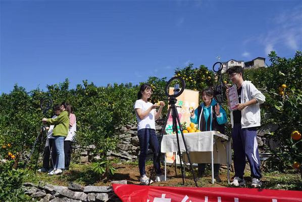 “我们的脐橙个个甘甜圆润,是不是很想吃?这是因为九畹溪镇得天独厚的自然条件使得这些橙子色泽红润、口感鲜美,赢得了人们的广泛喜爱……”10月29日上午,在湖北省宜昌市秭归县九畹溪镇一处脐橙种植基地,武汉工商学院电子商务学院大三学生巩香灵对着手机摄像头讲解手中的“九月红”脐橙,通过网络直播的方式帮当地村民销售农产品。