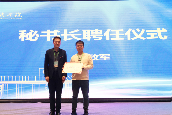 图为朱宜部长为秘书长和副秘书长颁发聘书