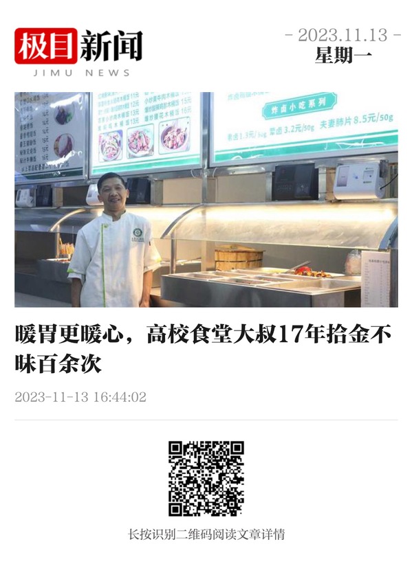 “那天着急上课,就把刚买的新手机忘在了食堂,还好遇到了张叔!”11月13日,武汉工商学院艺术与设计学院2021级学生阮鹏飞谈起该校食堂大叔张正平,不禁竖起大拇指。