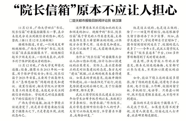这件事原本不应引起如此的关注和网友的担心。视频中的“书记、院长信箱”属于常见的工作类意见箱,主要收集师生员工希望解决的问题,以供校方办实事之用。这些意见和建议,完全可以敞开了说,无需避讳或担心不良后果。