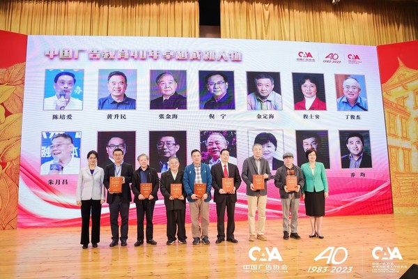 图为张金海教授(左三)在“中国广告教育40年卓越成就人物”颁奖现场