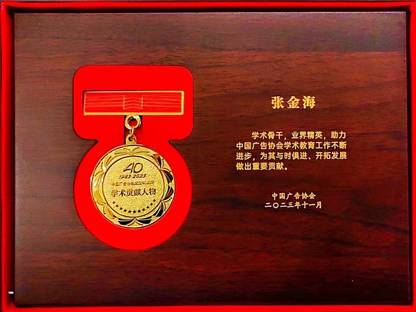 图为张金海教授荣获的“中国广告40年学术贡献人物”“中国广告教育40年卓越成就人物”奖牌和证书