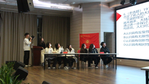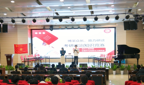 新闻中心讯(见习记者 邓小敏 蒋茂城)11月30日19:00,由武汉工商学院马克思主义学院主办,校青年马克思主义研究会协办的“博采众长,助力研途——考研政治竞赛”在体育馆0402报告厅拉开序幕,本次比赛共吸引了来自各二级学院的11支代表队参赛,最终来自应用技术学院的尹帅、管理学院的马永正与曹春雨3人组成的“点点星烁” 队凭借出色表现斩获一等奖。
