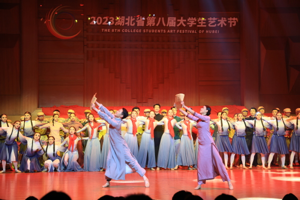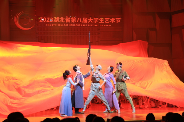 在开幕式现场,来自湖北省各大高校和专业院团的28件舞蹈作品同台展演。该校舞蹈表演系的学生们深情演绎了中国革命历史上一群顽强不屈、不怕牺牲的爱国青年、革命英雄,矢志不渝投身伟大红色革命事业的经典画面,带领观众走进了这段伟大的革命历史,接受了一场心灵的洗礼和深刻的党史学习教育、爱国教育。