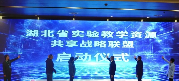 图为邓晓翠副教授(右一)代表学校参加湖北省实验教学资源共享战略联盟启动仪式