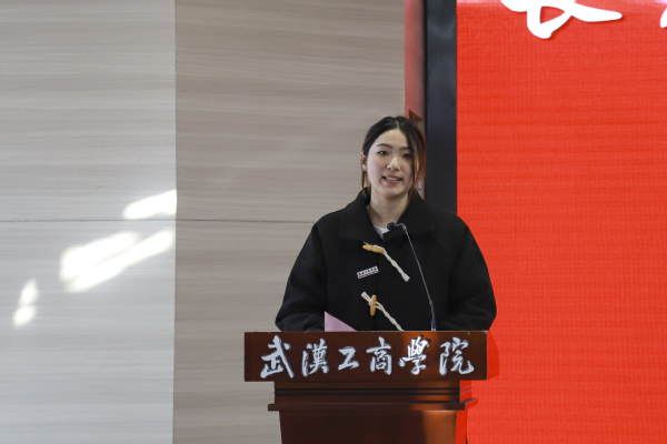 文法学院学生杨培作为优秀学生代表发言,向大家分享了自己在校电视台、大学生记者团以及宣传策划部的实践经历和感悟,她说:“在校园媒体工作的经历不仅增强了我的专业本领,也让我认识了学校很多优秀的老师、同学,她们的奋斗故事时刻激励着我要怀抱梦想,脚踏实地,让青春在奋斗中绽放绚丽之花。”她呼吁同学们要将个人理想融入新时代新征程,珍惜时光,努力奋斗,在新时代的“赶考”路上,续写武工商青年的青春奋斗故事!