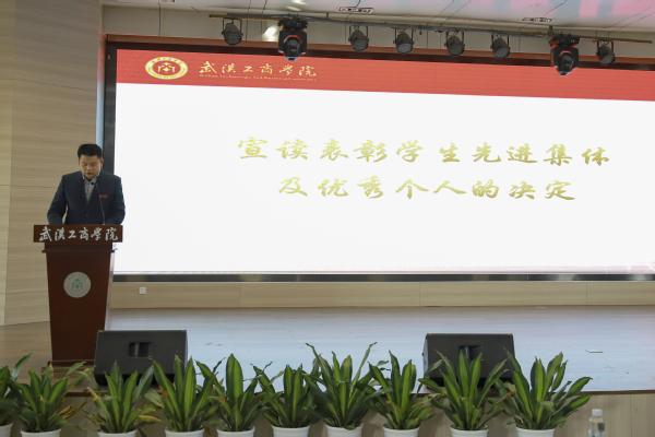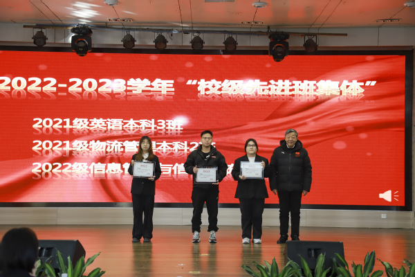 校团委书记邱玉添宣读了《关于表彰2022-2023学年度学生先进集体和优秀个人的决定》,授予2021级英语本科3班、2021级物流管理本科2班、2022级信息管理与信息系统本科1班3个班“校级先进班集体”荣誉称号;授予2021 级会计学本科2班、2021级物联网工程本科1班、2021级网络与新媒体本科4班等17个班“院级先进班集体”荣誉称号;授予余红、宋梦响等350名学生“校级三好学生”荣誉称号,张庭齐、刘文等688名学生“院级三好学生”荣誉称号;授予邱锦晔、吴萍等 237名学生“校级优秀学生干部”荣誉称号,夏晓玲、张智威等468名学生“院级优秀学生干部”的荣誉称号;授予魏冰青、陈周琪等119名学生一等奖学金,齐龙飞、孙嘉怡等 470 名学生二等奖学金,尹诗阳、李怡瑶等822名学生三等奖学金;授予王子勋、张津鹏等122 名学生“单项优秀奖”荣誉称号。