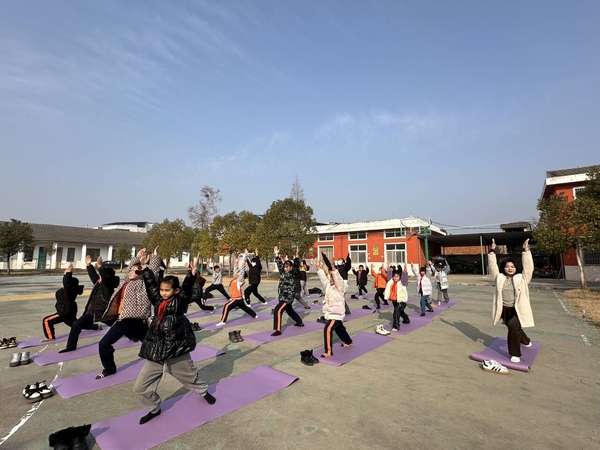 “请同学们将左脚向前迈出一大步,成弓步姿势,右腿伸直,双手向上举起,手掌在头顶合十……”1月10日上午,湖北省天门市多祥镇第二小学的操场上,一群孩子跟着老师在崭新的瑜伽垫上学习瑜伽,这些瑜伽垫都是武汉工商学院公共课部的5位老师捐赠的,此外,还捐赠了跳绳、体适能器材、篮球、足球、排球等共计100余件体育用品。