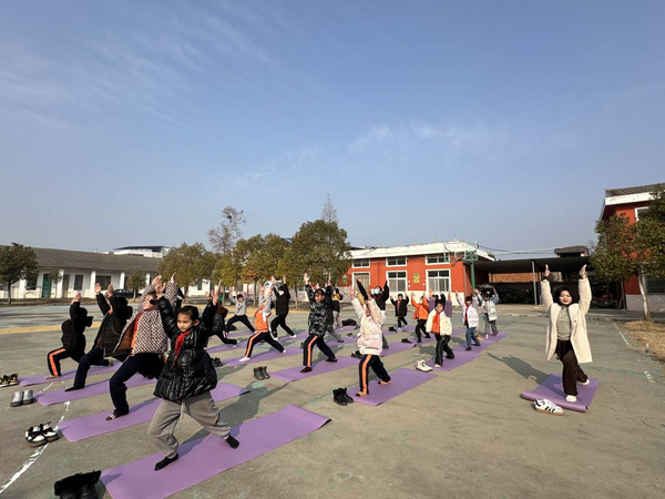 “请同学们将左脚向前迈出一大步,成弓步姿势,右腿伸直,双手向上举起,手掌在头顶合十……”1月10日上午,天门市多祥镇第二小学的操场上,一群孩子跟着老师在崭新的瑜伽垫上学习瑜伽,这些瑜伽垫都是武汉工商学院公共课部的5位老师捐赠的,此外,还捐赠了跳绳、体适能器材、篮球、足球、排球等共计100余件体育用品。
