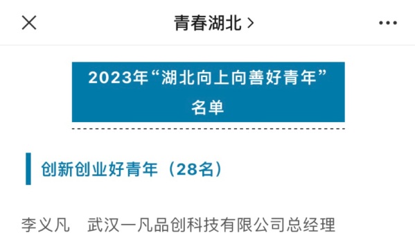新闻中心讯(记者 杨培)2月18日,共青团湖北省委公布了2023年“湖北向上向善好青年”名单,武汉工商学院校友、文法学院2021届毕业生李义凡名列其中,荣获“创新创业好青年”荣誉称号。