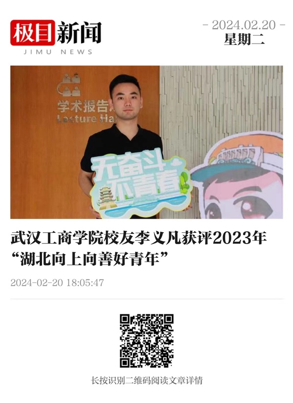 2月18日,共青团湖北省委公布了2023年“湖北向上向善好青年”名单,武汉工商学院校友、文法学院2021届毕业生李义凡名列其中,荣获“创新创业好青年”荣誉称号。
