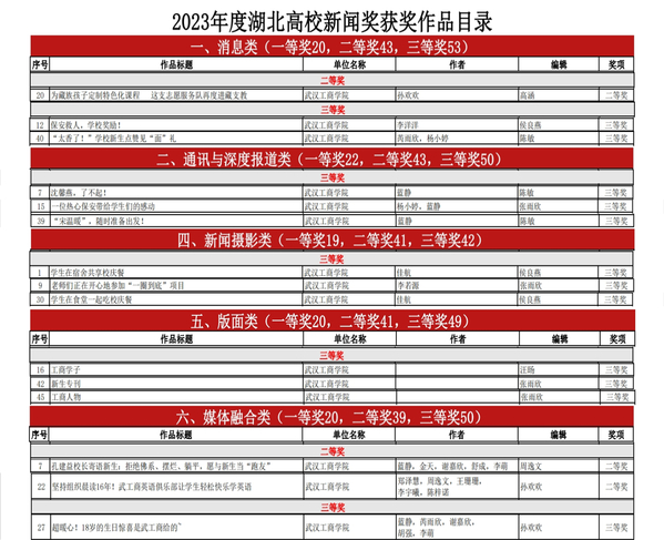 宣传策划部老师李洋洋的作品《保安救人,学校奖励!》,以及宣传策划部老师芮雨欣和学生记者杨小婷的作品《“太香了!”学校新生点赞见“面”礼》荣获消息类三等奖;宣传策划部老师蓝静的作品《沈馨燕,了不起!》《“宋温暖”,随时准备出发!》以及和学生记者杨小婷共同撰写的作品《一位热心保安带给学生们的感动》荣获通讯与深度报道类三等奖;通讯员佳航的作品《学生在宿舍共享校庆餐》《学生在食堂一起吃校庆餐》,以及学生记者李若源的作品《老师们正在开心地参加“一圈到底”项目》荣获新闻摄影类三等奖;宣传策划部老师蓝静、芮雨欣、李萌和学生记者谢嘉欣、胡强的作品《超暖心!18岁的生日惊喜是武工商给的》荣获媒体融合类三等奖;校报《武汉工商学院视界》第148期3版“工商学子”(编辑:汪旸)、第151期4版“新生专刊”(编辑:张雨欣)和第152期4版“工商人物”(编辑:张雨欣)荣获版面类三等奖。