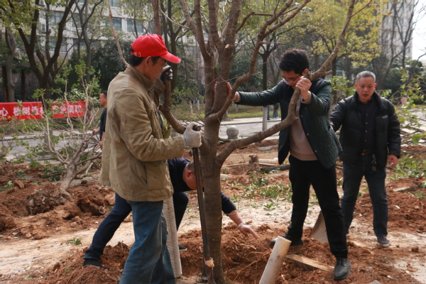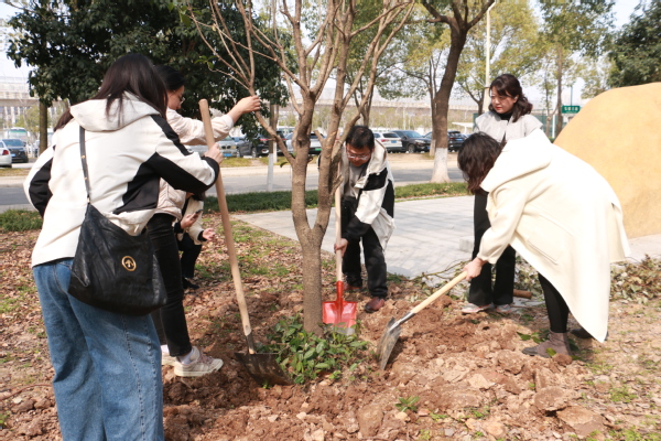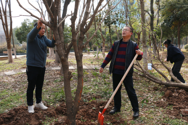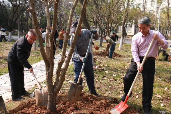 新闻中心讯(记者 杨培 杨小婷 涂媛媛)“树根周围不能堆太多土,要注意松土,这样方便后期浇水。”3月12日下午,在武汉工商学院实验教学中心附近的一片绿化林里,学校校长孔建益手握铁锹,一边给新种的树木培土,一边和老师们交流着种树的细节。