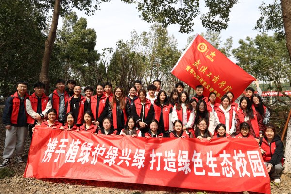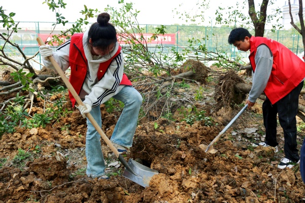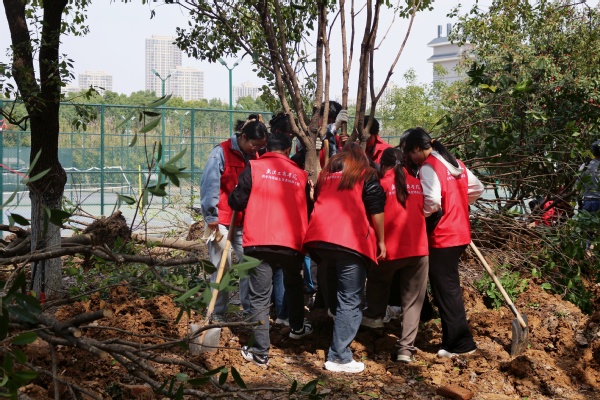 原来,这是武汉工商学院后勤管理部和校团委在全国第46个植树节当天,联合开展的“绿色校园·你我同创”主题活动。校长孔建益,副校长桂裕清、左宗文,总会计师王程军,党委副书记幸福堂,校长助理刘春,各相关职能部门负责人与来自学校“青年马克思主义者培养工程”培训班的全体学生一起参与了本次活动,共同用行动践行生态文明理念,打造绿色生态校园。