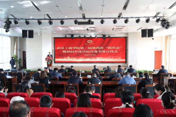 新闻中心讯(记者 杨小婷 杨培)3月14日8:30,武汉工商学院第二届教职工代表大会、工会会员代表大会第四次会议暨2024年度目标任务书签订仪式在体育馆0402报告厅隆重举行。校长孔建益,党委书记、省政府教育督导专员刘生元等校领导出席大会,130名“两代会”代表参会。大会由刘生元书记主持。