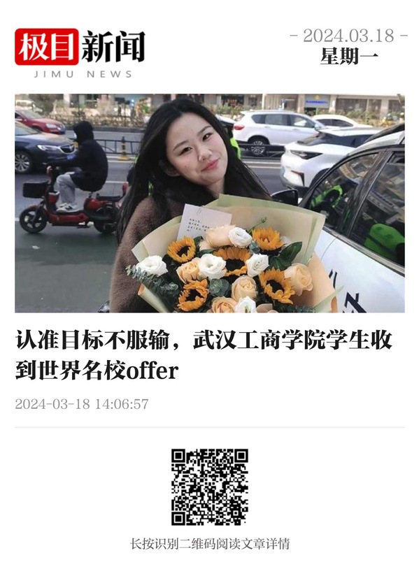 “我被英国诺丁汉大学商业与管理专业录取啦,9月就能去英国读研了。”日前,武汉工商学院管理学院2020级旅游管理专业学生曹桐开心地把这个喜讯告诉老师。此外,她还收到纽卡斯尔大学以及埃克塞特大学的“offer”。