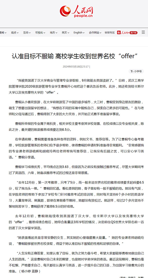 “我被英国诺丁汉大学商业与管理专业录取啦,9月就能去英国读研了。”日前,武汉工商学院管理学院2020级旅游管理专业学生曹桐开心地把这个喜讯告诉老师。此外,她还收到纽卡斯尔大学以及埃克塞特大学的“offer”。