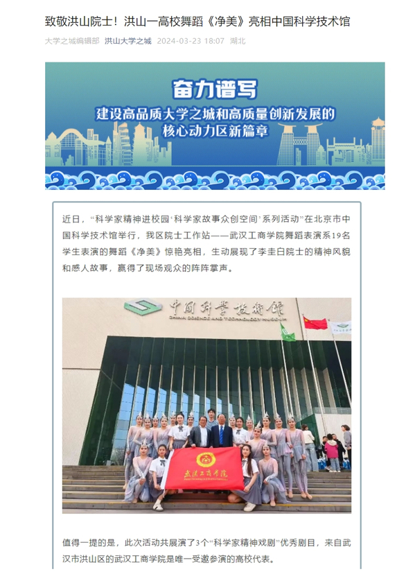 近日,“科学家精神进校园‘科学家故事众创空间’系列活动”在北京市中国科学技术馆举行,我区院士工作站——武汉工商学院舞蹈表演系19名学生表演的舞蹈《净美》惊艳亮相,生动展现了李圭白院士的精神风貌和感人故事,赢得了现场观众的阵阵掌声。
