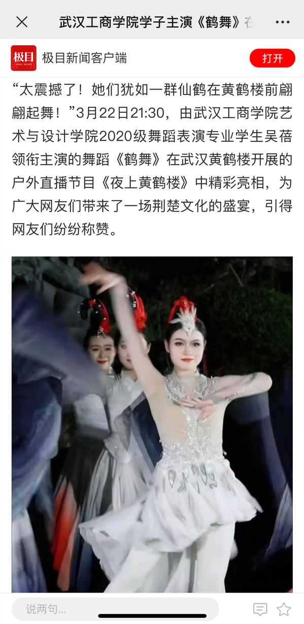 “太震撼了!她们犹如一群仙鹤在黄鹤楼前翩翩起舞!”3月22日21:30,由武汉工商学院艺术与设计学院2020级舞蹈表演专业学生吴蓓领衔主演的舞蹈《鹤舞》在武汉黄鹤楼开展的户外直播节目《夜上黄鹤楼》中精彩亮相,为广大网友们带来了一场荆楚文化的盛宴,引得网友们纷纷称赞。
