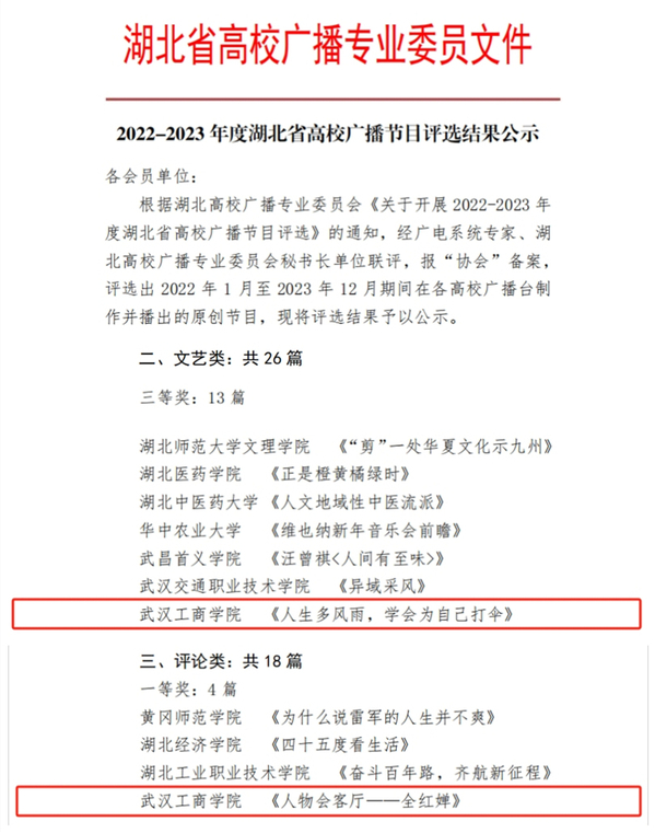 新闻中心讯(记者 李萌)近日,湖北省高校广播专业委员会公布了2022—2023年度湖北省高校广播原创节目评选结果,武汉工商学院选送的2件作品分别荣获一等奖和三等奖。