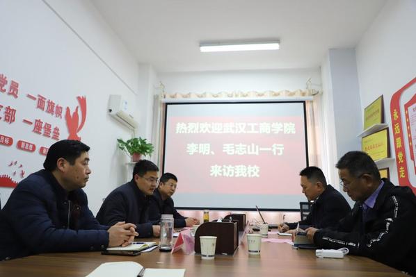 新闻中心讯(特约记者 杨沁)为进一步推动高水平应用型大学建设,加强校际交流合作,积极开展学校产学研创基地建设,3月26日,武汉工商学院实验教学中心主任李明、副主任毛志山带队赴黄淮学院开展“产学研创基地建设”专题调研。黄淮学院校企合作与校友工作处处长张得生、大学生就业创业指导中心主任汤震、校企合作与校友工作处副处长贾敏晓、校企合作与校友工作处校企合作科科长房义斌在该校综合楼420会议室会见了李明一行并展开座谈交流。