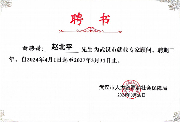新闻中心讯(记者 万风)4月2日上午,武汉市就业专家顾问聘任仪式在武汉市人力资源和社会保障局会议室举行,市人社局党组书记、局长朱建寰为武汉工商学院副校长赵北平等7位专家颁发了武汉市就业专家顾问聘书。