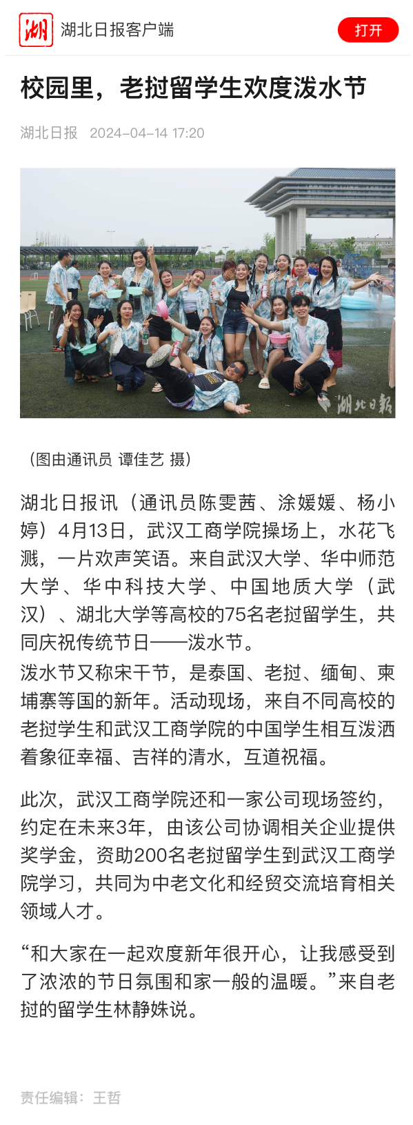 湖北日报讯(通讯员陈雯茜、涂媛媛、杨小婷)4月13日,武汉工商学院操场上,水花飞溅,一片欢声笑语。来自武汉大学、华中师范大学、华中科技大学、中国地质大学(武汉)、湖北大学等高校的75名老挝留学生,共同庆祝传统节日——泼水节。