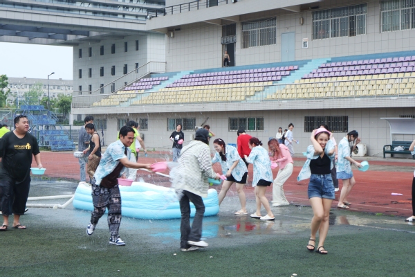 在泼水节活动现场,人头攒动、水花飞溅,来自不同院校的老挝留学生学生在操场上追逐嬉戏,和武汉工商学院的学生相互泼洒着象征幸福、吉祥的清水,一支支喷出的水柱、一盆盆泼洒的水花、一声声诚挚的祝福,让中老两国的学生们迸发出了友谊的火花。