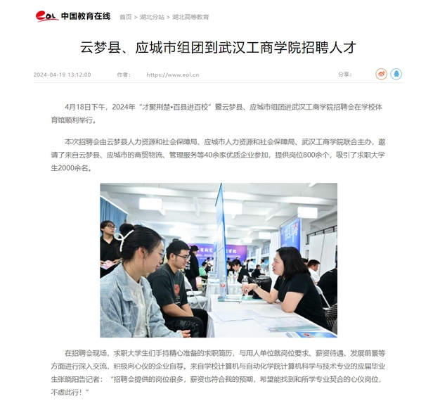 云梦县公共就业和人才服务中心副主任杨世鹏介绍道:“此次招聘会为企业和高校毕业生之间提供了一个面对面、零距离的交流平台,有效促进了就业信息的流通和匹配。”他希望,未来能与武汉工商学院加强合作与交流,吸引更多优秀的人才到云梦县建功立业。
