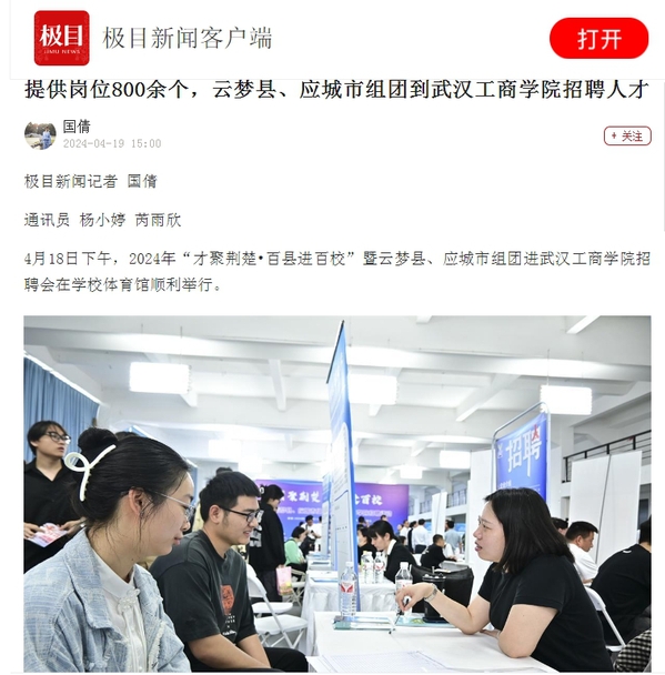 4月18日下午,2024年“才聚荆楚•百县进百校”暨云梦县、应城市组团进武汉工商学院招聘会在学校体育馆顺利举行。