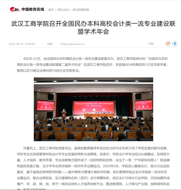 4月20-21日,由全国民办本科高校会计类一流专业建设联盟主办,武汉工商学院承办的“全国民办本科高校会计类一流专业建设联盟第二届学术年会”在武汉工商学院召开,来自国内54所高校的127位专家学者、教师以及10家企业单位的16位行业专家参会。