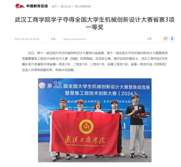 近日,第十一届全国大学生机械创新设计大赛湖北省省赛、第十一届全国大学生机械创新设计大赛慧鱼组竞赛暨慧鱼工程技术创新技术大赛(国赛)结果揭晓。在名校云集,强手如林的赛场上,武汉工商学院6支参赛队首次参赛就夺得省赛一等奖3项、二等奖1项、三等奖1项,国赛三等奖1项。省赛一等奖作品《顶呱呱》还进入拟晋级国赛名单,有望冲击国赛。