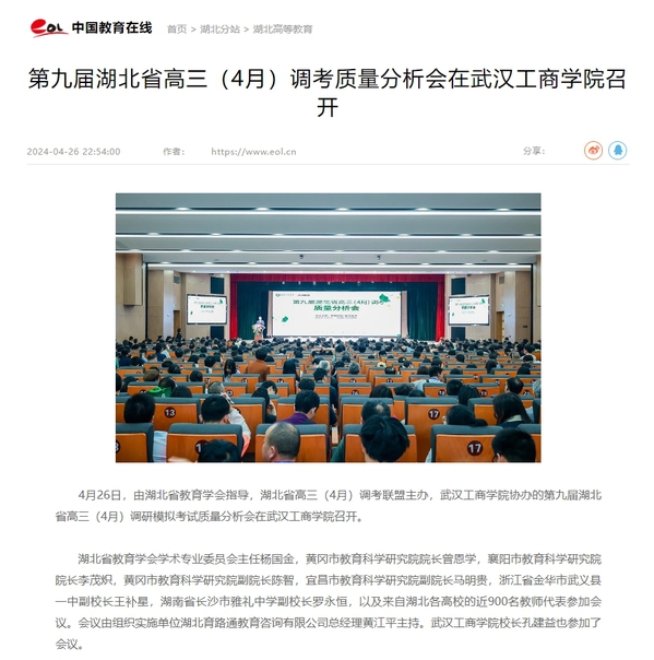 4月26日,由湖北省教育学会指导,湖北省高三(4月)调考联盟主办,武汉工商学院协办的第九届湖北省高三(4月)调研模拟考试质量分析会在武汉工商学院召开。